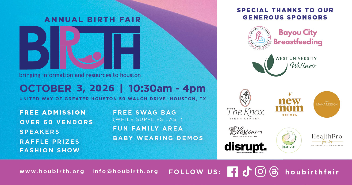 We are working to create the emergence of a Houston community which promotes healthy, natural and safe birth for mothers and babies by providing access to information and resources in person, in print and on-line. We encourage high standards and provide a support network for Houston’s birth community.